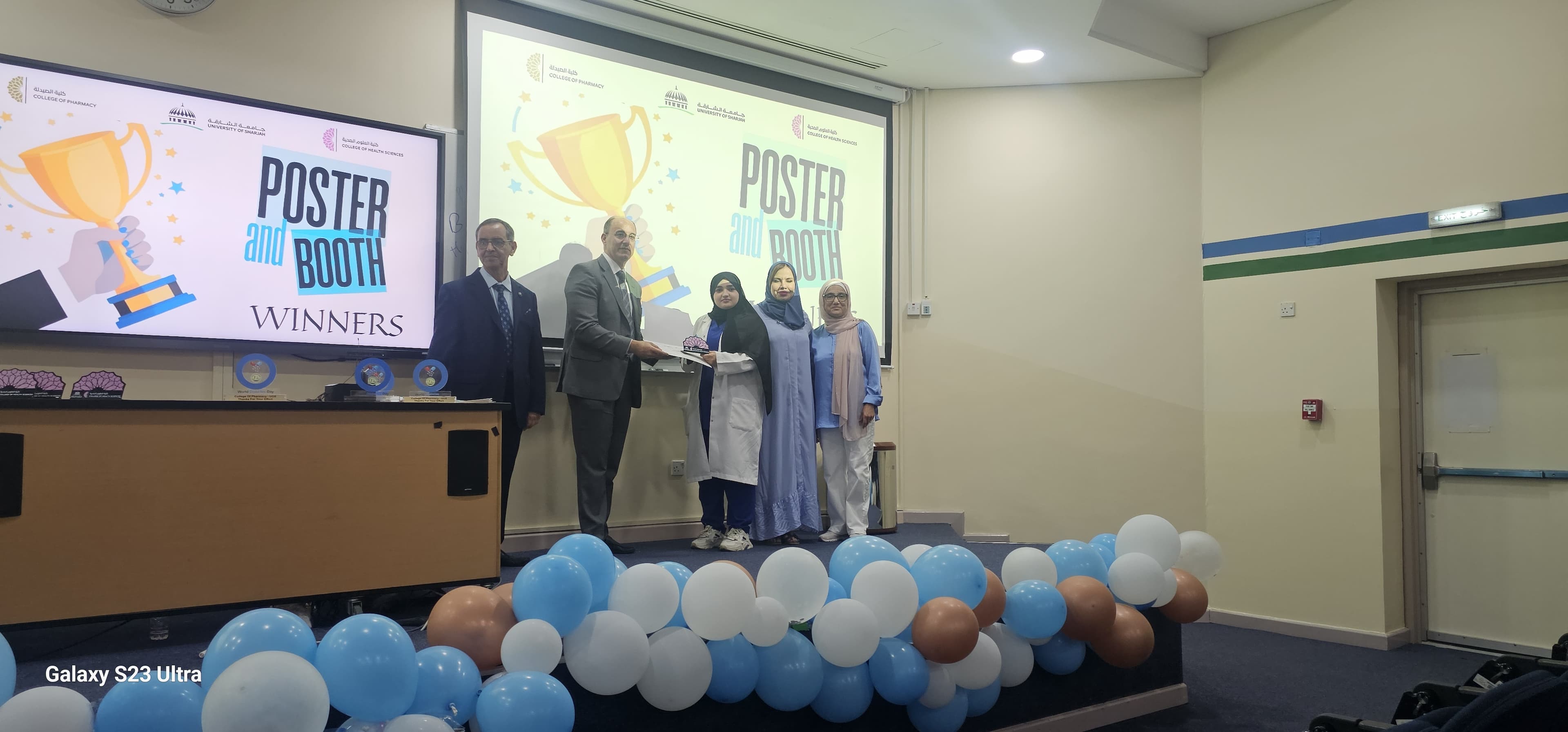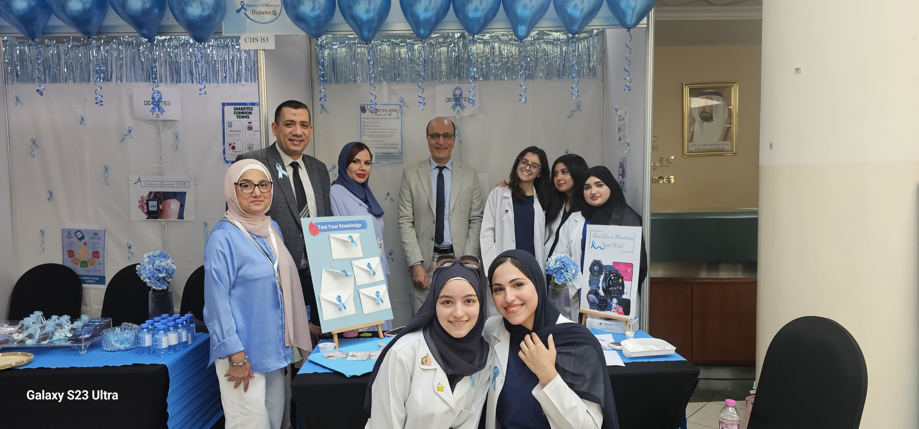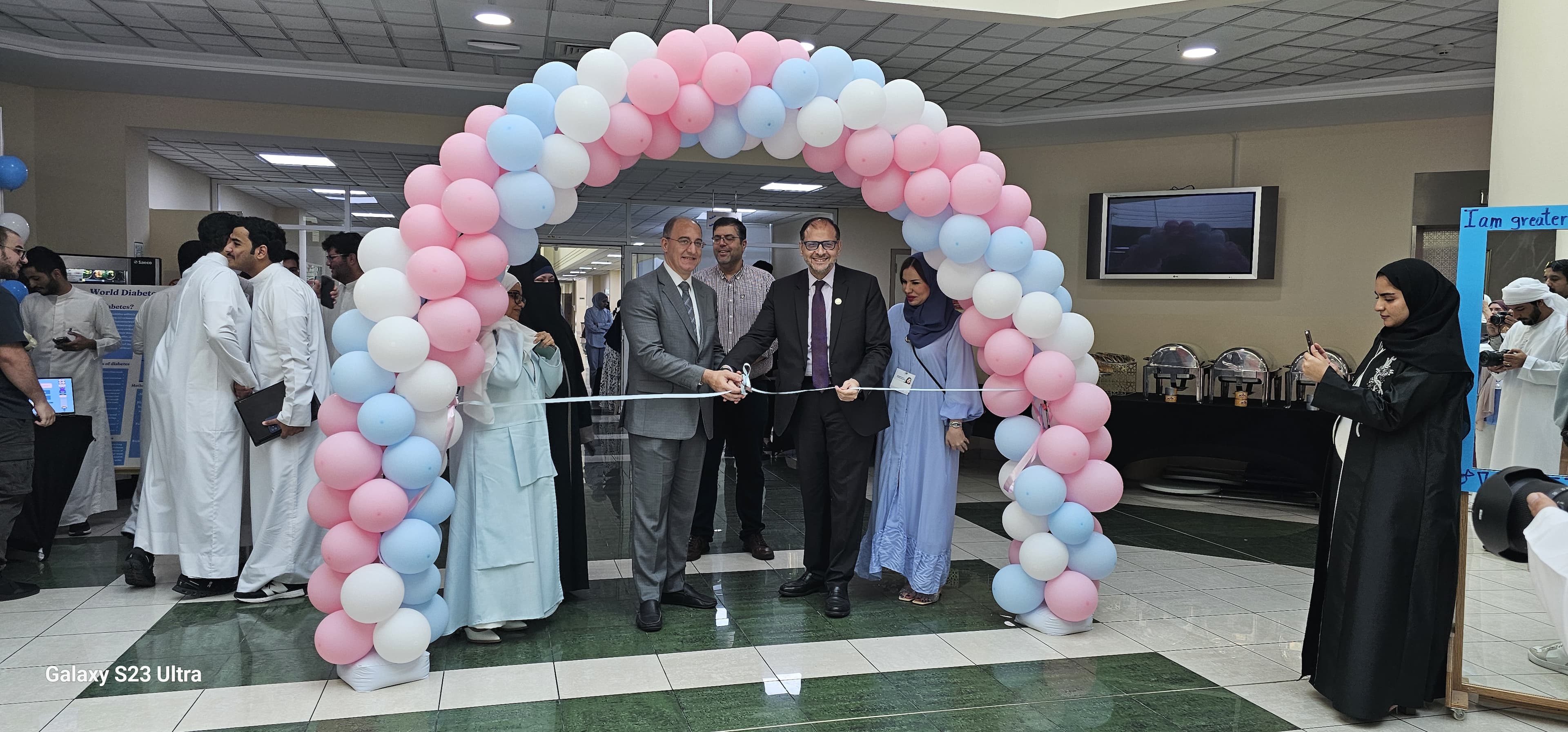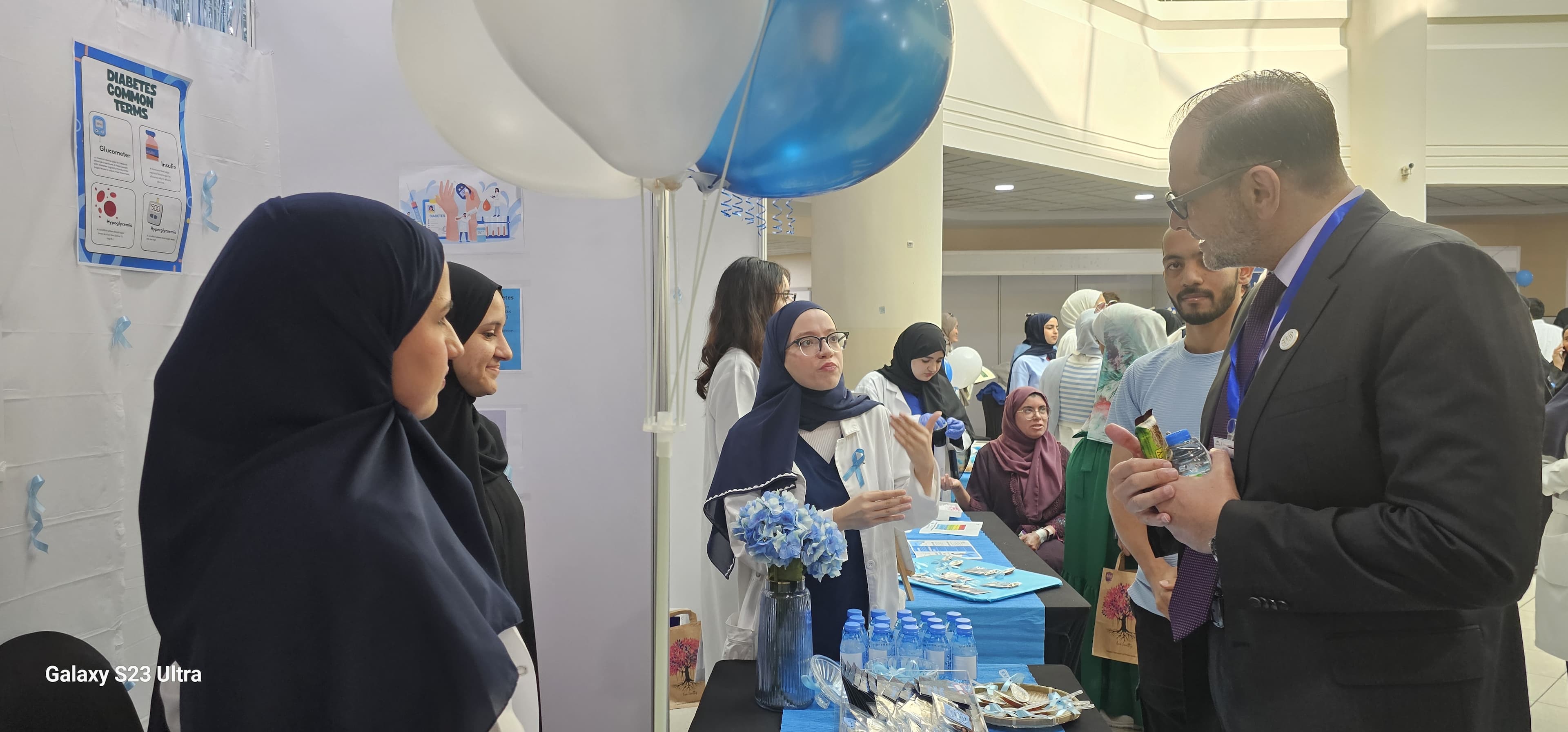 بمناسبة اليوم العالمي للسكري، نظمت كلية الصيدلة، بالشراكة مع كلية العلوم الصحية، يومًا توعويًا تثقيفيًا. هدفت الفعالية من خلاله إلى رفع مستوى الوعي العام حول مرض السكري والكشف المبكر عنه. أسهم طلاب قسم علوم المختبرات الطبية بفعالية من خلال تنظيم ركن تفاعلي وغني بالمعلومات. عرض الركن موادَّ تعليمية تُشدد على أهمية الكشف المبكر عن مرض السكري، وقدّم فحصًا لسكر الدم، كما تضمن ملصقًا توعويًا مُصممًا خصيصًا لهذا المرض. وقد فاز ركن قسم علوم المختبرات الطبية بالمركز الثاني في مسابقة أفضل ركن بين أقسام الكلية السبعة