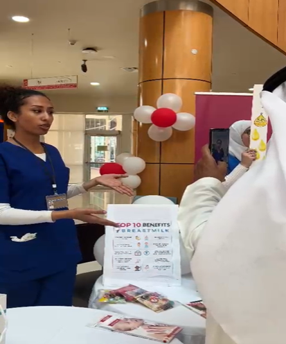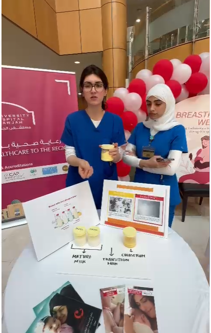 في إطار الأسبوع العالمي للرضاعة الطبيعية، نظمت طالبات التمريض من برنامج تمريض الأمومة والمواليد الجدد في كلية العلوم الصحية بجامعة الشارقة فعاليةً في مستشفى الجامعة بالشارقة بعنوان "الاحتفاء بجمال الرضاعة الطبيعية وقوتها". هدفت الفعالية إلى تثقيف ودعم الزوار والمرضى وموظفي المستشفى، وسلّطت الضوء على الفوائد الصحية للرضاعة الطبيعية للأمهات والأطفال. كانت هذه التجربة قيّمة للغاية بالنسبة للطلاب، إذ عززت مهاراتهم في التثقيف الصحي، والمشاركة المجتمعية، وتنظيم الفعاليات. قاموا بإعداد كتيبات ونماذج وملصقات تثقيفية لتسهيل المناقشات التفاعلية وتبادل الموارد، وتعزيز الوعي ودعم الرضاعة الطبيعية. لم يقتصر هذا الحدث على تعزيز المشاركة المجتمعية فحسب، بل أظهر أيضًا التزام الطلاب بتمكين الأسر وبناء مجتمعات أكثر صحة. نتقدم بجزيل الشكر لإدارة مستشفى الجامعة بالشارقة على دعمها وإتاحة الفرصة لهم لخدمة المجتمع.