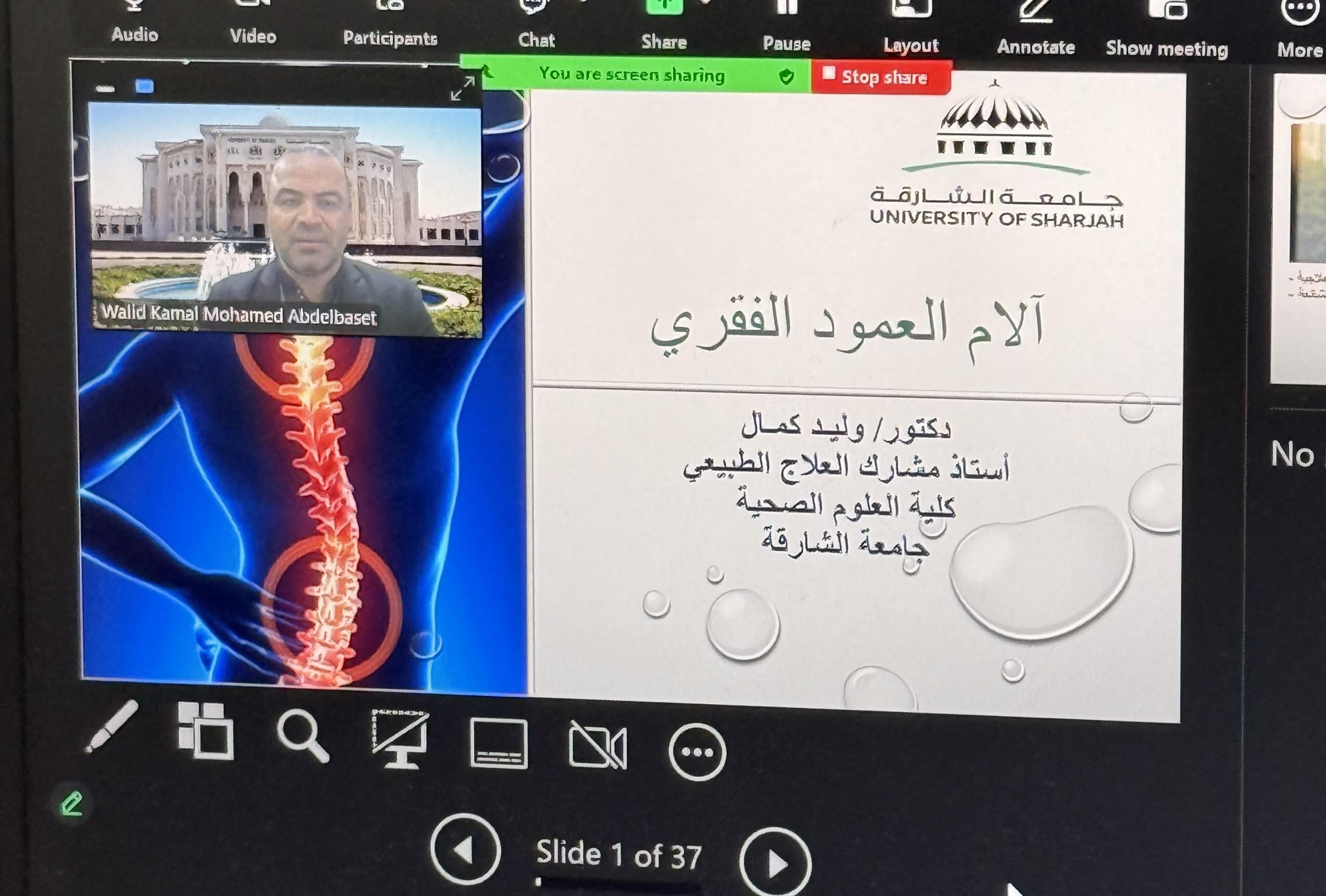 تشرّف مركز التميز في الشيخوخة الصحية بجامعة الشارقة بالمشاركة في فعالية اليوم العالمي للعمود الفقري، التي أقيمت في 16 أكتوبر 2025. وتضمّن الحدث محاضرةً تفاعليةً عبر الإنترنت قدّمها د. وليد كمال ممثلاً للمركز، وركّزت على تعزيز صحة العمود الفقري والتوعية بين أفراد المجتمع. وتعكس هذه المشاركة التزام المركز المستمر بالمشاركة المجتمعية والتعليم وتعزيز مبادرات الشيخوخة الصحية عبر مختلف القطاعات الصحية.