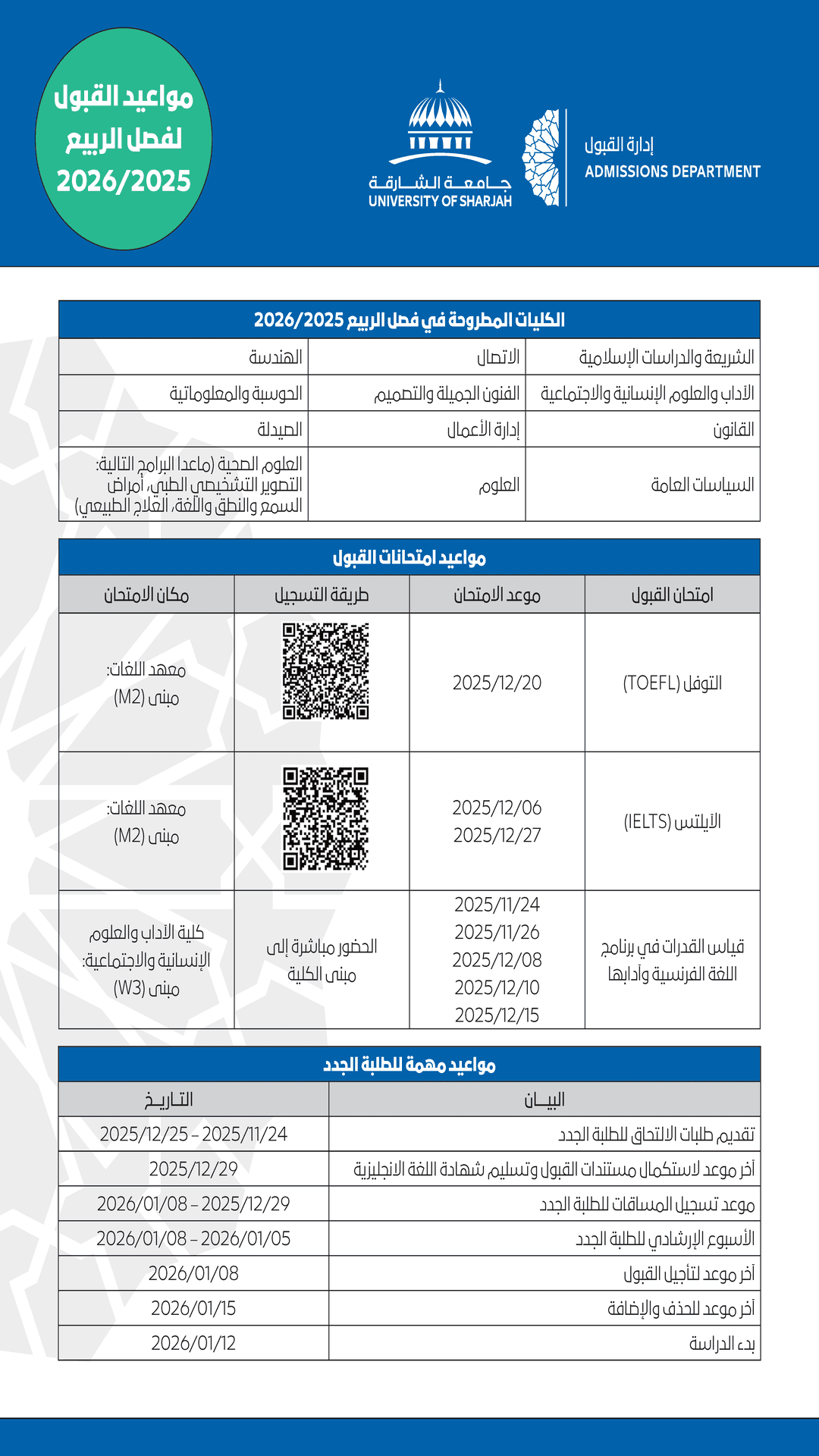 نود إعلامكم بأن فترة القبول لفصل الربيع 2026 ستبدأ من 24 نوفمبر 2025 وحتى 25 ديسمبر 2025.