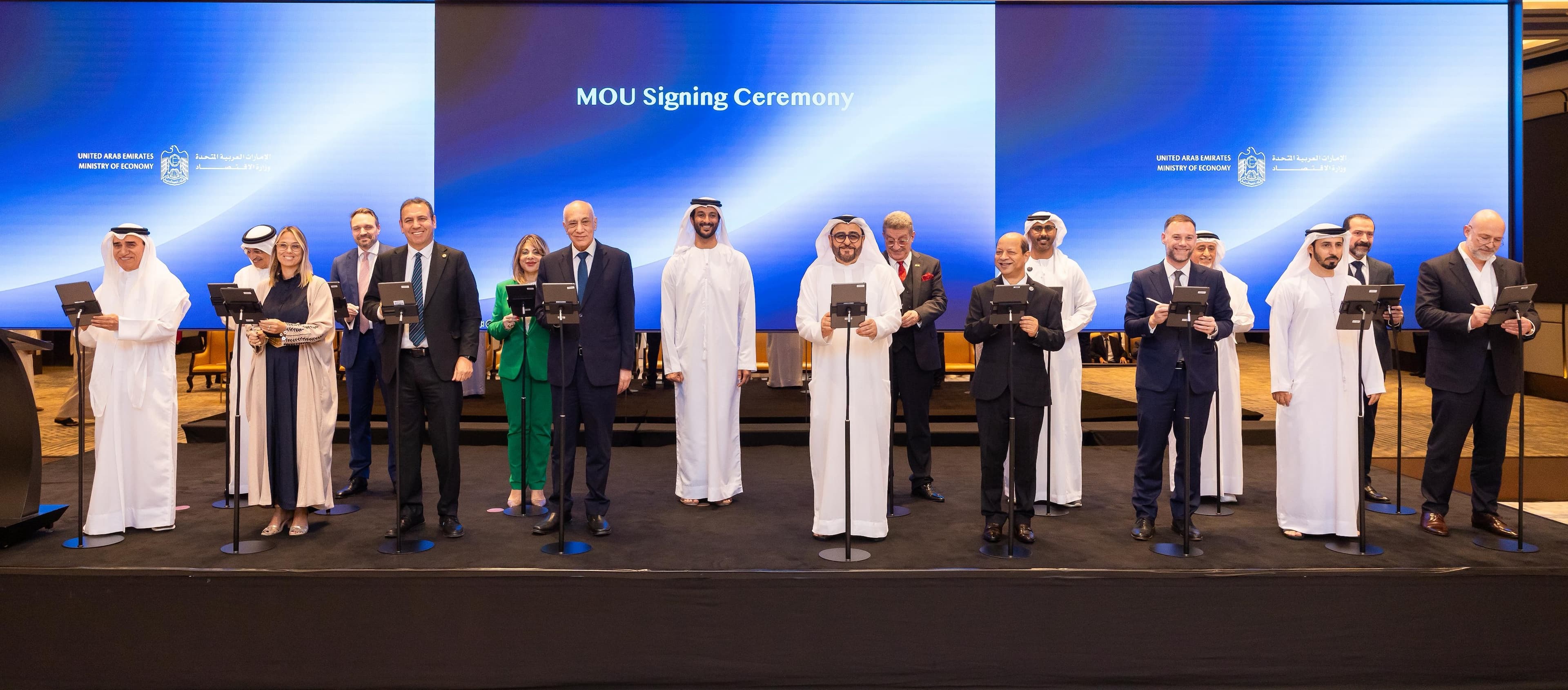 وقعها الأستاذ الدكتور عصام الدين عجمي مدير جامعة الشارقة، وسعادة عبدالله آل صالح وكيل وزارة الاقتصاد. جاء ذلك خلال إطلاق مركز المعرفة والابتكار التي نظمتها الوزارة، بحضور معالي عبد الله بن طوق المري وزير الاقتصاد، وعدد من مسؤولي الوزارة وقيادات المؤسسات الأكاديمية المشاركة.