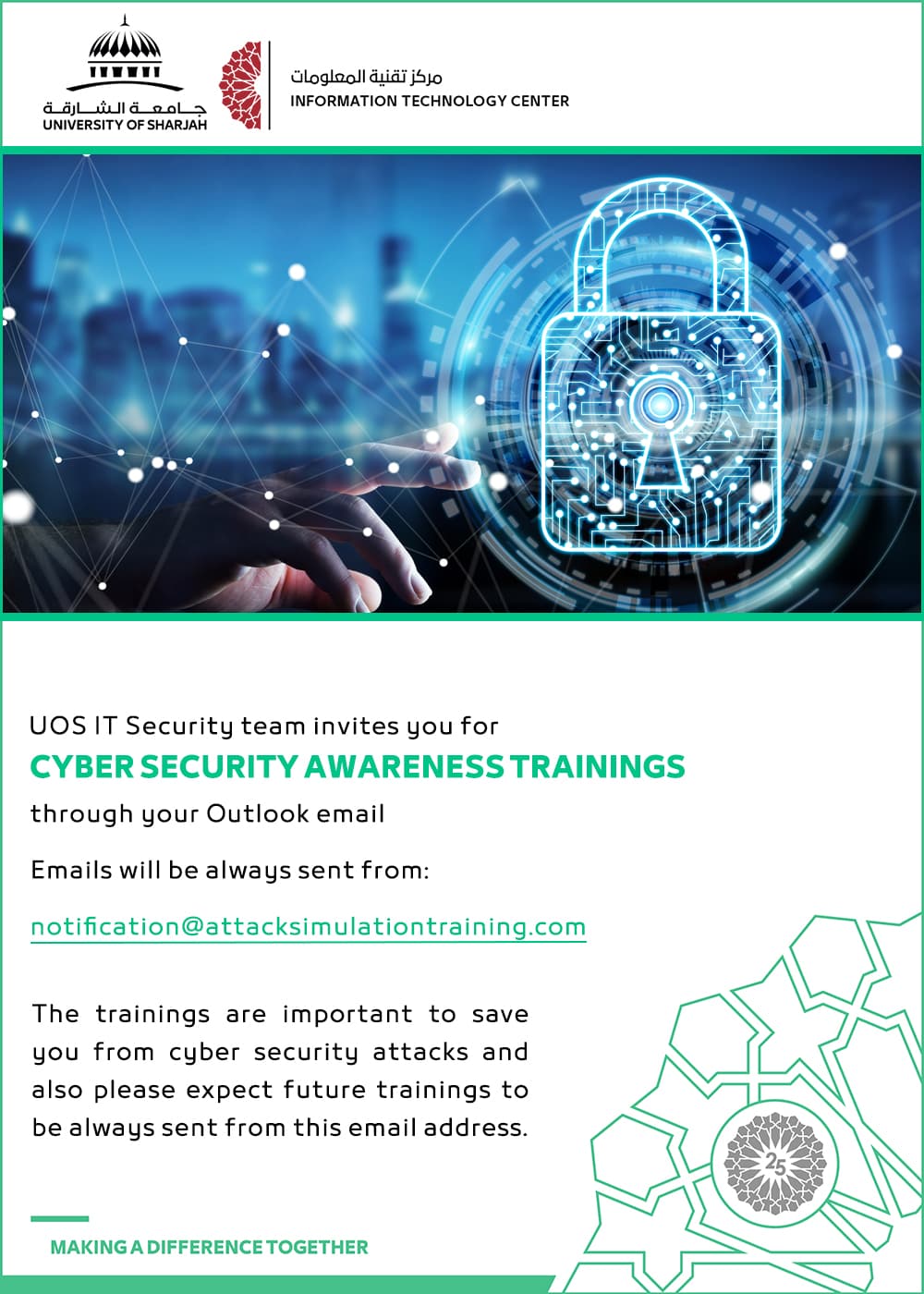 يرجى العلم بأن هذه التدريبات على درجة عالية من الأهمية لحمايتكم من الاختراقات الأمنية المعلوماتية. لذا ، نود التأكيد على ضرورة متابعة البريد الإلكتروني بشكل مستمر للاطلاع على كل ما يردكم من رسائل تتضمن مجموعة متعددة من التدريبات .