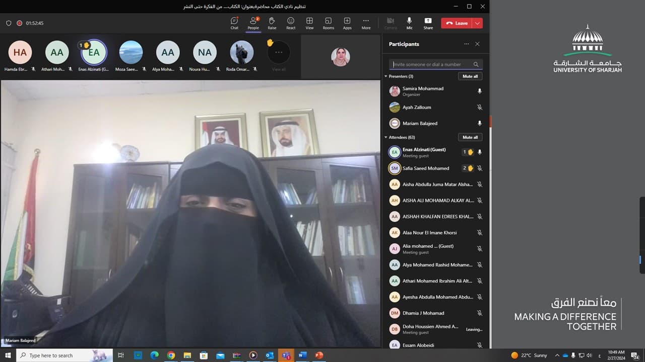 ضمن أنشطة نادي الكتاب للطالبات ، نظم قسم الأنشطة الطلابية في عمادة شؤون الطالبات محاضرة افتراضية بمناسبة شهر شهر القراءة بعنوان: الكتاب: من الفكرة حتى النشر، قدمتها الدكتورة مريم بالعجيد رئيس قسم اللغة العربية وآدابها، وحضرها العديد من اسرة الجامعة من الهيئة الأكاديمية والإدارية والطلابية. حيث تحدثت الدكتورة مريم عن خطوات تأليف الكتاب من بداية الفكرة واهداف الكتابة وماذا نكتب وكيف نكتب ولماذا النشر وكيفية النشر . كما تطرقت لعرض كتاب بعنوان : كيف تؤلف كتابك الأول ، للمؤلف محمد معتوق الحسين ، وختتمت المحاضرة بالتحدث عن دور ومنصات للنشر المختلفة في الامارات وشجعت الجميع للبدء بنشر كتابهم ليكون أثر مفيد لهم.