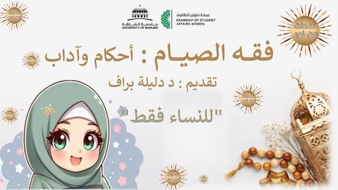 مع بداية شهر رمضان نظم قسم الانشطة الطلابية بعمادة شؤون الطالبات من خلال أنشطة مبادرة "نفحات من نور" لشهر رمضان محاضرة ( فقه الصيام: أحكام وآداب) وذلك ضمن جهودها لنشر الوعي الديني وتعزيز الفهم الصحيح لشعائر الإسلام من خلال نفحات ثقافية دينية واجتماعية. تناولت المحاضرة، التي قدمتها الدكتورة دليلة براف من كلية الشريعة والدراسات الاسلامية، أهم الأحكام الفقهية المتعلقة بالصيام للمرأة، فضلاً عن آدابه وسننه، مستندة إلى الأدلة من القرآن الكريم والسنة النبوية. وشهدت الفعالية تفاعلًا من الحضور النساء، الذين طرحوا أسئلتهن واستفساراتهن حول الموضوع. وأكدت المبادرة استمرارها في تقديم مثل هذه اللقاءات التوعوية خلال شهر رمضان، بهدف تعزيز الثقافة الدينية وترسيخ القيم الإسلامية للطالبات بشكل خاص ولأسرة الجامعة والمجتمع بشكل عام.