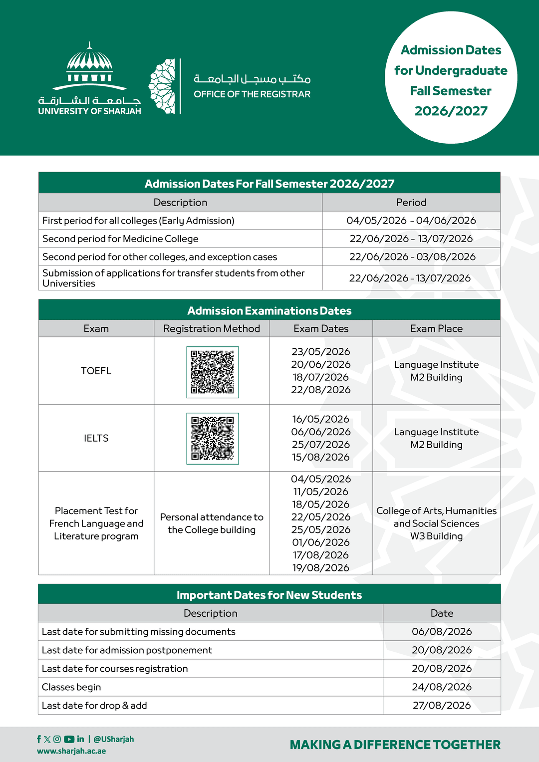 Please be informed that the admission periods for fall semester 2026/2027 will be as follows: